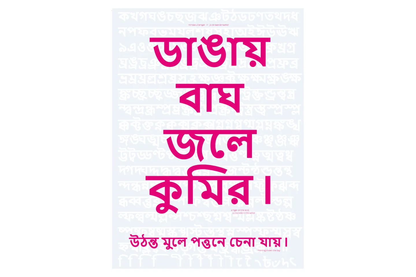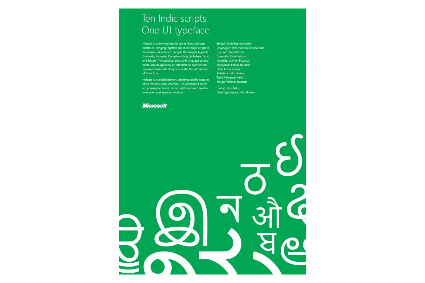 The typeface was art-directed by Fiona Ross, produced by John Hudson, hinted by Ross Mills. Fiona Ross and John Hudson also designed the Devanagari and Odia, David Březina designed the Gujarati, Valentin Brustaux the Telugu, Jo De Baerdemaeker the Bengali and Fernando de Mello Vargas the Malayalam and Tamil. The Latin from Segoe UI is by Steve Matteson.