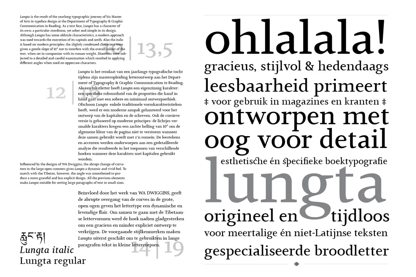 Influenced by the designs of W. A. Dwiggins, the abrupt change of curvature in the counters gives it a dynamic, vivid feeling. To match with the Tibetan however the angle was smoothed to produce a more graceful and less explicit design. All previous elements make Lungta suitable for use in large paragraphs of text set in small sizes.
