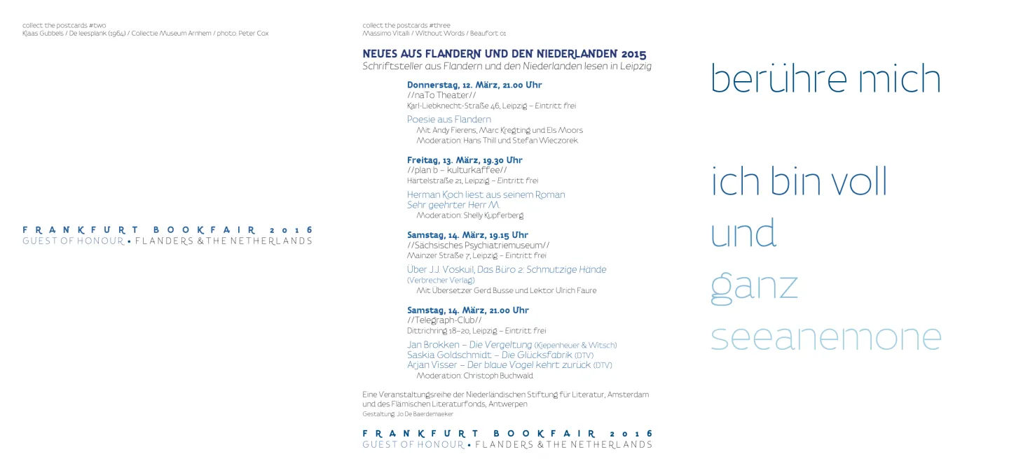 As it turns out, creative nods to the partnership between Flanders and the Netherlands are omnipresent in the project’s branding. Take the colour scheme: the blues in the logo, which, Moeyaert (2015) explains, represent the blues of the Westerschelde, the mouth of the River Scheldt, where the two territories of the Netherlands and Flanders flow together. Complementing the blues is a yellow/grey, the colour of North Sea beach sand. The notion of fluidity between the two partners is further activated in a typeface designed by Jo De Baerdemaeker especially for the fair, whose letter structure is inspired by the famous typographical collections of Plantin-Moretus of Antwerp, Johannes Enschedé & Zonen of Haarlem, and Lettergieterij Amsterdam. A large collection of ligatures has been added so that each letter runs into the next, illustrating again the ‘dynamic flow’ between the Netherlands and Flanders.” – from “This Is What We Share. Co-branding Dutch Literature at the 2016 Frankfurt Book Fair” by Jack McMartin